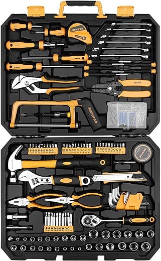 - PRACTICAL:Rich accessories of updated tools placed in this kit.Comprehensive assortment of professional-grade wrenches, ratchets,hammer, tape measure, pliers, wrench,and etc. Variety of 1/4-inch screwdriver bits: Phillips, slotted, square, star and pozi