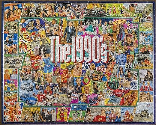 - 1990 PUZZLE: Feel nostalgic for the 90s with a 1990s collage puzzle that features favorite TV shows, movies, merchandise, politicians, technology, celebrities, and other icons