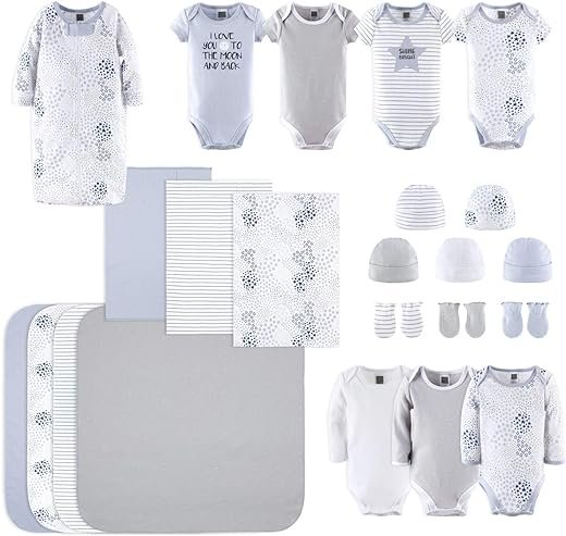 Introducing the 23 Must-Have Accessories gift set for newborn babies. This adorable set includes a variety of clothes and linens such as bodysuits, sleep sack, beanies, mittens, burp cloths, and receiving blankets. Made from soft 100% cotton, these clothes are cozy and breathable. Perfect for all seasons, they can be layered or worn as standalone outfits. Ideal as a baby shower gift, this set has everything new parents need. Winner of the Top Parenting Products Award, the Peanutshell Layette is a must-have for welcoming a new baby.