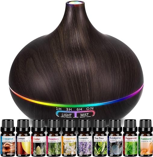 - Diffuser with Essential Oils Set: The essential oil set includes our most popular wood grain essential oil diffuser (550ml upgraded version) and top 10 pure essential oils. Lavender, tea plant, peppermint, eucalyptus, lemon, orange, rosemary,frankincense,cedarwood, cinnamon essential oils go perfectly with ultrasonic oil diffuser to bring inviting, lively, and aromatic scent.