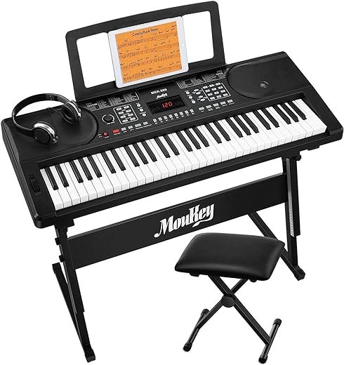 - 🎵【Unique Musical Instrument Gifts】The package includes everything you need to start: an easy-to-assemble stand, an X-braced collapsible stool, Headphone, a sheet music holder, Keyboard Sticker, Power Supply.(Microphone not included)