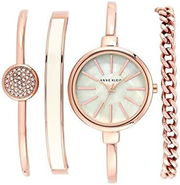 Introducing a stylish and functional timepiece for the modern woman. This watch features a slightly domed mineral crystal and a mother-of-pearl dial adorned with rose gold-tone hands and markers. The rose gold-tone bangle can be adjusted to fit your wrist perfectly, and it comes with a jewelry clasp and 1 extender for added convenience. The set also includes two additional bracelets – one with ivory enamel inlay and another accented with clear premium crystals. With a Japanese-quartz movement and a case diameter of 32mm, this watch offers precise timekeeping in a sleek design. Please note that it is not water-resistant.