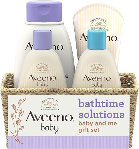 - 4-piece Aveeno Baby Daily Bathtime Solutions Baby & Me Gift Set is a collection of baby bath essentials in a convenient, reusable wicker basket that includes everything you need for bath time with your little one, plus a bonus for mom
