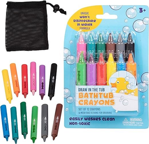 • Make bath time fun with Bathtub Crayons. Set of 12 with mesh bag to hang for draining.