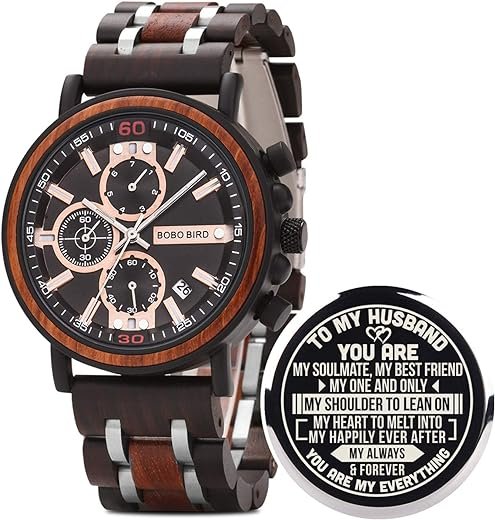 1. This watch combines imported technology and the highest standards of craftsmanship for exceptional quality.2. Crafted from handmade natural wood, the watch is not only smooth and comfortable to wear but also made with genuine materials like zebra wood and resin, not plastic.3. Choose from a variety of styles including luxury, fashion, retro sport, and classic wristwatch. Plus, the adjustable wrist band comes with a free fix tool for easy customization.4. This engraved watch makes for a classic gift, perfect for husbands. It’s guaranteed to garner praise at any occasion.5. With a lifetime before and 2-year after-sale service, as well as BOBO BIRD Manufacture Warranty, we provide a 100% guarantee and high-quality service. We’re always there for you, ensuring your satisfaction.