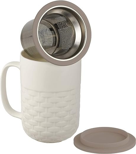 Introducing the Weave Textured Design Mug, featuring a smooth top and a 3-inch textured bottom, offering a stylish touch. Enjoy your favorite loose leaf teas and tea bags with the stainless steel Tilt & Drip tea infuser. The comfortable handle and weight make it a pleasure to drink from, without the worry of heat in the microwave. The heat-resistant silicone lid doubles as a coaster and sits securely on the mug. Made from FDA-approved New Bone China, this microwave-safe mug and lid are dishwasher safe for convenience. Elevate your tea experience with this practical and elegant mug.
