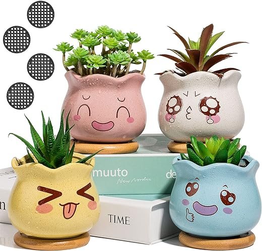 - Unique Pattern Design -This set of cute pots is printed with different facial expression. Wave shaped opening makes it better for the soil and the plant to breath in the air and looks more stylish. Come in 4 different colors: white, blue, yellow and pink. Add some cute elements to your home or office.