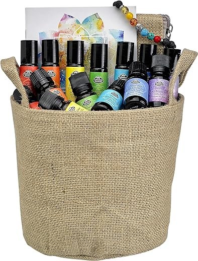 - 18 Piece Set – 7-10mL Pure Essential Oil Blends, 7-10mL Pre-Diluted Roll-Ons, Chakra Braclet, Chakra Guide, Roll-On Travel Bag comes in Kraft Gift Basket