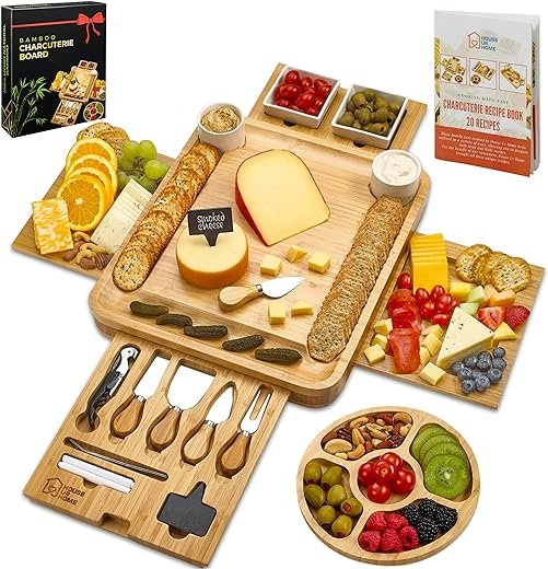 - 🎁 SEE &FEEL LUXURY OF A PREMIUM CHARCUTERIE BOARD & CUTLERY SET! Made from Eco- Friendly, Sustainably grown and 100% natural bamboo, Our cheese board will add a touch of elegance to your every party or family gathering the slide out Tray has 4 knives, that are made of high quality stainless steel with bamboo handles that are easy to grip. In addition the wooden board sets comes with 2 CERAMIC BOWLS 2 PLATES & 3 Slat Labels 2 Markers & WINE OPENER & 2 Server Forks Will make your cheese- Tasting!