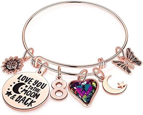• BIRTHDAY GIFTS FOR GIRL: 8 Year old birthday gifts bracelet engraved with lucky number 8, heart, moon, star, sunflower, butterfly charms… Fabulous and inspirational birthday present jewelry for 8th birthday celebration milestone in her life.