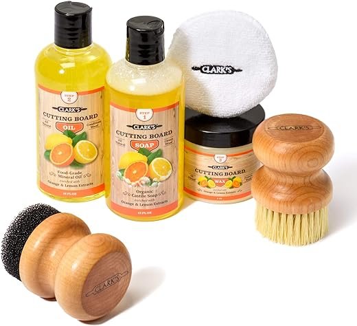 • PACKAGE CONTENTS: Our package includes CLARK’ S Cutting Board Soap (12oz), Food Grade Mineral Oil for cutting board (12oz), and Butcher Block Wax (6oz). Also provided are CLARKS Custom Applicator, Scrub Brush and Buffing Pad for optimal care of your wood surfaces