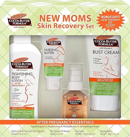 • New Mom Gift Set: Pamper the new mom with this 4 piece gift set of after pregnancy skincare essentials; This set includes Tightening Body Lotion, Nursing Butter, Bust Cream and Skin Therapy Oil to help firm and tone stretched skin