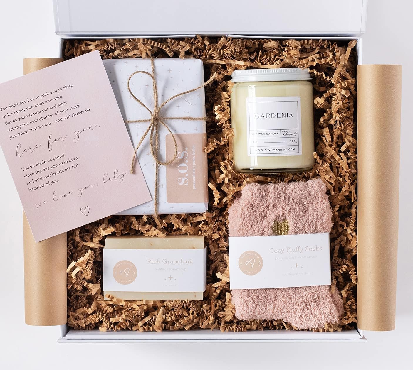 Give your daughter the perfect gift as she heads off to college with this high-end gift basket set. It includes essential items like a personal alarm for safety, a gardenia candle for relaxation, cozy socks for comfort, and handmade organic soap for pampering. The set comes in a beautiful reusable magnetic close gift box, making it the ideal gift for a daughter moving away. Its premium quality and sentimental value make it a great farewell gift for a military daughter deployment as well. Show your love and support with these luxurious gifts from mom and dad.