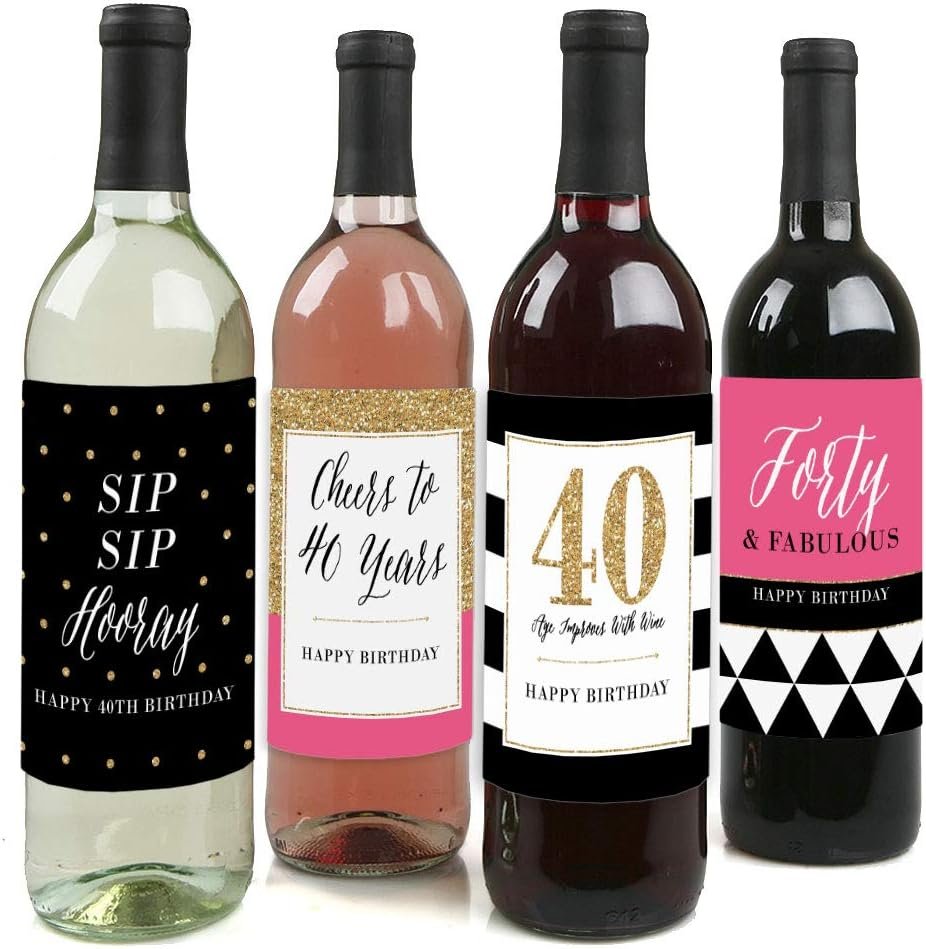 - MADE IN THE USA: Chic 40th Birthday – Pink, Black and Gold – Wine Bottle Labels are designed and manufactured at our Wisconsin facility using materials that are Made in the USA. Please Note: Wine in image is not included. Chic 40th Birthday Wine Bottle Labels No-Mess Glitter Print: Our beverage labels are designed with a printed image of glitter, eliminating glitter flake while maximizing bling effect!