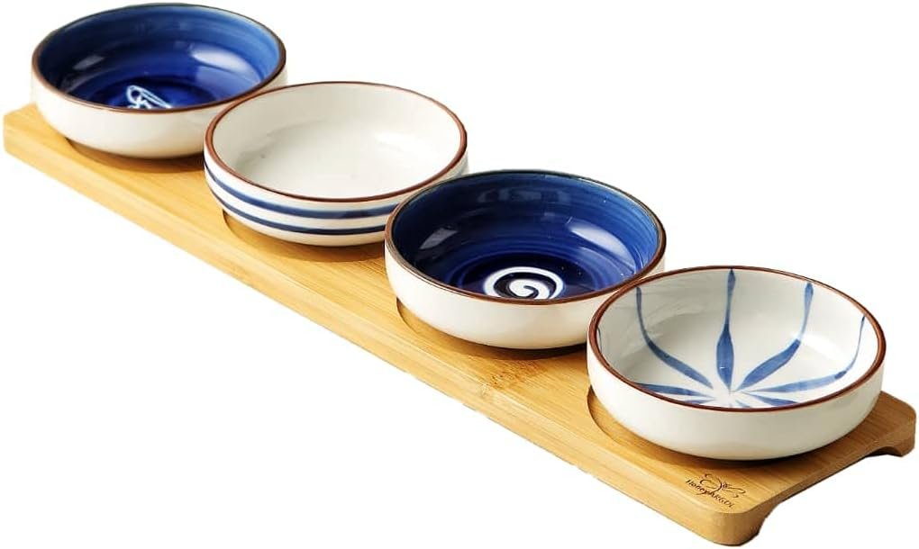 • Set includes 4 Small Ceramic Serving Dishes with Bamboo Tray. Serving Dishes: 10*10 cm (3.93 in*3.93 in). Bamboo Tray: 39*9.5 cm (15.35 in*3.74in).