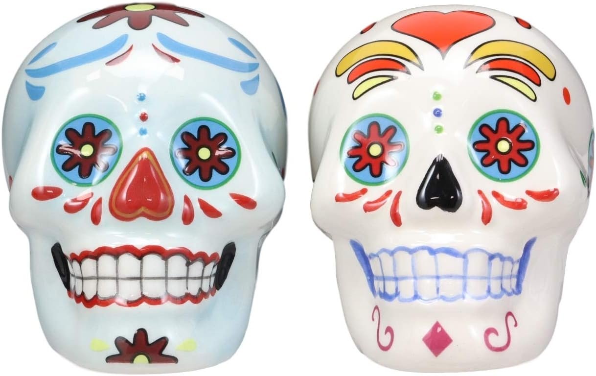 - Now you can complete your Day of the Dead sugar skull collection with this beautiful set of sugar skulls salt and pepper shakers. Each ceramic shaker is hand painted with a colorful and detailed Mexican folk art design typical of a traditional Day of the Dead or Dia de los Muertos sugar skulls.