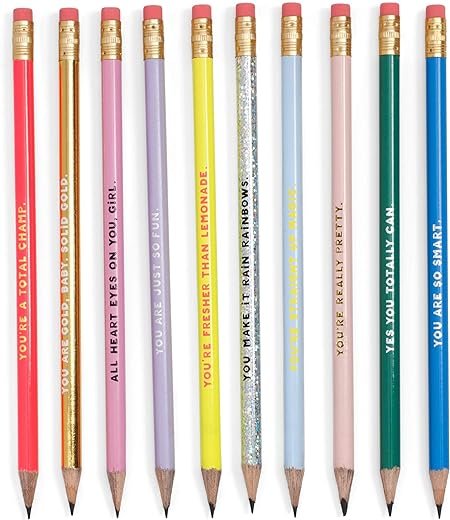 Graphite pencils in this set are pre-sharpened, allowing you to start writing immediately. The pack includes 10 no. 2 lead pencils with a non-smudge eraser end. These vibrant pencils come in bold colors and feature compliments that boost confidence. With options like pastel, neon, holographic, and metallic, there’s a pencil to fit any style. These compliment pencils make tasks like homework, sudoku, and paperwork more enjoyable.
