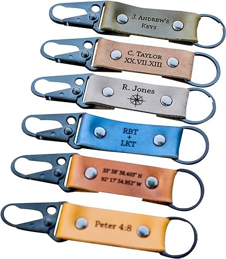 This handcrafted keychain measures 5.5″ in length and 1″ in width. It is skillfully made in the USA using top-quality Italian leather. The keychain features a sturdy carabiner clip for added durability. It can be personalized with various options, such as anniversary dates in roman numerals, special coordinates, Bible verses, nicknames, company logos, monograms, or even Morse code. Express yourself and make this keychain uniquely yours. Find it on different websites that we recommend.