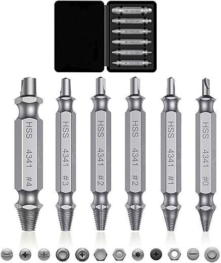 - 6-PIECE SCREW EXTRACTOR SET – The screw extractor set(#0, #1, #2, #2, #3, #4) works with any drill and any size screw or bolt. This damaged screw extractor can remove all common sizes of damaged, stripped or broken screws.