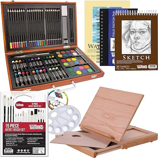 Introducing the ultimate art set for artists of all levels! This deluxe 104-piece kit has everything you need to unleash your creativity. With high-quality watercolor paints, oil pastels, colored pencils, and more, you can create breathtaking masterpieces. The set also includes a convenient wooden case, sketch pads, paintbrushes, and a desk easel with storage. Our non-toxic paints and materials are safe for artists of all ages. Give the gift of artistic inspiration with this premium art set!