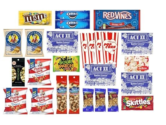 • Gift box includes: 2 Redbox DVD Rental Code, 4 Act II Butter Lovers Microwave Popcorn packs 2.75 oz, 4 Movie Theater Style Popcorn Containers, 2 Blue Diamond Smokehouse Almonds 1.5 oz, 1 Wonderful Pistachios 1.5 oz, 1 Red Vines 5 oz, Sour Patch Kids 2 oz, 1 M&Ms1.74 oz, 3 Cracker Jack 1.25 oz, 2 Oreo 6-Cookie Pack 2.4 oz, 1 Skittles 2.17 oz, 2 Pirate Booty 0.5 oz, 3 Planters peanuts 1 oz