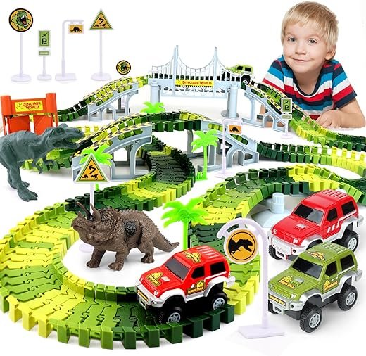 Get ready to unleash your child’s imagination with the AUUGUU Deluxe Dinosaur Track Set. With 187 pieces, including flexible track, trees, a bridge, and more, kids can create endless configurations for their toy SUVs to navigate. The set also features realistic T-Rex and Triceratops figures, sparking curiosity about the prehistoric world. The motorized cars and safe, durable materials make this toy perfect for 3-year-old boys and girls. Passes the highest safety standards. Give your child hours of fun and learning with this environmentally-friendly dinosaur playset.