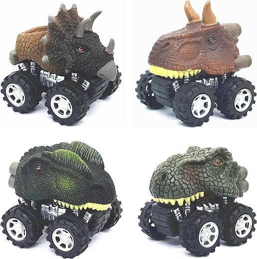 Introducing the [NOVELTY], a set of 4 dinosaur-shaped cars (Triceratops, Tyrannosaurus Rex, Dilophosaurus, and Tatankacephalus) that are sure to captivate kids. These cars are made from non-toxic and durable thick plastic, with a slightly soft shell to prevent scratches. They are also very strong and adhere to US toy safety standards. Perfect for birthdays, Easter, Christmas, or party favors, these cars are powered by a simple pull back mechanism, requiring no extra batteries. With a suitable size for 3 to 5-year-olds, these cars provide endless fun and excitement.
