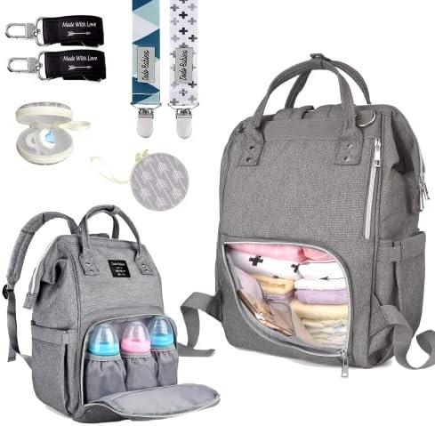 • MODERN DIAPER BAG SET: Backpack style pack has multiple pockets to hold bottles, diapers, changing accessories, wet clothing, and more. Set includes two bonus pacifier clips and coordinating blue binky case. Features comfy straps, modern neutral gray exterior, unisex design great for men and women. Ideal for busy days, taking a casual stroll, and a great gift for a new mom or dad