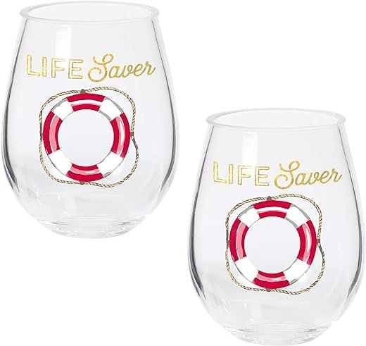 - These stemless wine glasses feature a bright red and white lifeguard float with the text ”life saver” written in gold print.