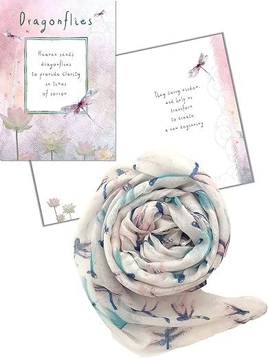The Inspirational Dragonfly Greeting Card is a 5×7 inch card made of ultra smooth velvet paper. It comes with a Peel and Press envelope and sealing sticker. This beautiful card, printed and made in the USA, features a dragonfly design and a heartfelt message about finding clarity in times of sorrow and creating a new beginning.The Dragonfly Scarf is made of voile material and comes in a lovely white, pink, and blue color. This 70.68 x 15.75 inch scarf is packaged in a semi-transparent button bag, making it a perfect gift.These gifts are suitable for occasions such as bereavement, sorrow, loss, and grief. They serve as a beautiful sentiment for someone going through a difficult time or needing encouragement for a brighter future.Please note that while we recommend these products, we do not manufacture or provide any product services like warranty or return policies.