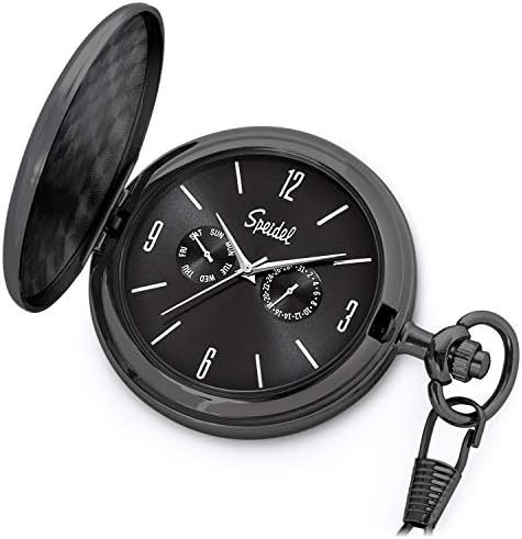 Precision analog quartz movement with a seconds hand, day and date sub-dials at 9 and 3 o’clock. The engravable brushed satin finish case comes with a removable 14″ diamond cut curb chain. The easy-to-clasp spring ring ensures a secure hold. The push button crown at 3 o’clock makes it convenient to open, read, and adjust the time in the palm of your hand. This is a perfect gift for holidays, birthdays, or any special occasion.