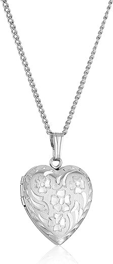 This product, previously known as Amazon Collection and now called Amazon Essentials, offers a unique hand engraved locket with two inner photo windows. It is rhodium plated to prevent tarnishing and has a hidden hinge and spring ring clasp. Handcrafted in the USA, these silver pieces are built for longevity. To maintain its lustrous appearance, store it in a dark, cool, dry place and avoid rubbing it against other plated items. Avoid exposure to cleaning products and perfume, and consider replating at a local jeweler if needed.