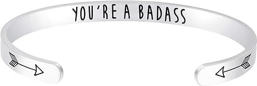 Introducing our CREATIVE & MOTIVATIONAL cuff bracelet! Made of premium stainless steel, it features a hidden message “YOU’RE A BADASS” and arrows on each end. The adjustable design allows it to fit most wrists, making it perfect for women, men, and teens. This lightweight bracelet is hypoallergenic and fadeless, suitable for everyday wear. It’s a unique and personalized gift idea for loved ones, reminding them of their inner strength and motivating them to pursue their dreams. We are dedicated to providing excellent customer service, so contact us if you have any issues.