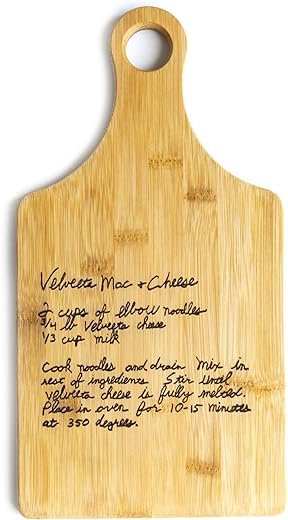 - The cutting board total measurement with handle is 13.5 inches x 7 inches and less than 1/2 in thick. The area for the handwritten recipe is 7.5 inches x 6 inches only.
