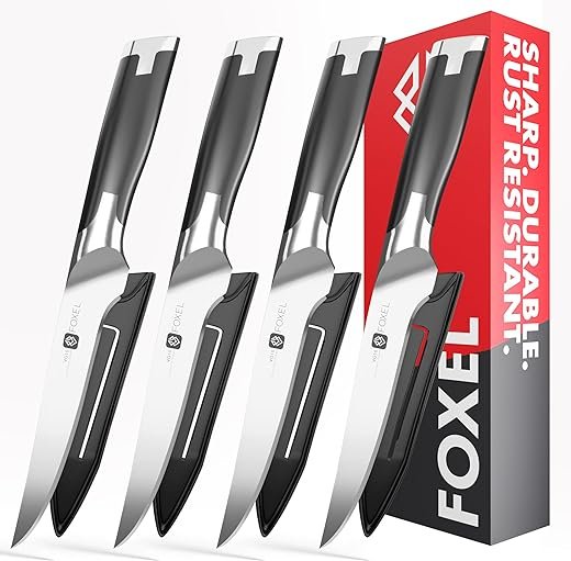 - [Steak Knives Set of 4] The Smoothest Cut from the Best Steel – If you haven’t tried a non-serrated steak knife before, you’re in for a treat. This knife will glide through steak like a bird through air. VG10 Steel allows for a higher Rockwell hardness of 58-60 and therefore, a sharper cut. VG10 is a more expensive steel and that’s why this steak knife set is priced higher. Other steels can’t handle a higher Rockwell hardness. They become brittle at those levels making them prone to chipping.