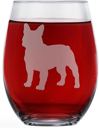 - Celebrate your favorite dog breed – Proud French Bulldog parents, these glasses are for you! Each stemless glass has 2 etched silhouettes of an adult French Bulldog on the outside, and the special breed name etched into the bottom. Comes in a set of 2 for sharing!