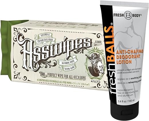 The Bundle includes Fresh Balls lotion for men, a talc-free solution that prevents wetness and chafing. It goes on as a soothing cream and dries as a cooling powder, keeping your sensitive areas dry and fresh. Asswipes are large body wipes made with a durable microcloth. Infused with chamomile, cucumber, aloe, and vitamin E, these wipes are perfect for on-the-go cleanups. They are alcohol-free, paraben-free, and fragrance-free, and safe to flush. Both products are made in the USA from globally sourced materials, free from talc, parabens, and aluminum.