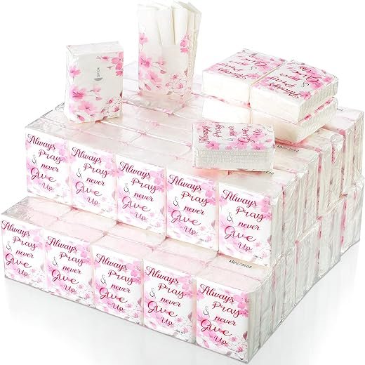 - Pocket Size: the tissue packs travel size are moderately smaller, and the saying “always pray & never give up” is printed on the pack, to give you encouragement and consolation