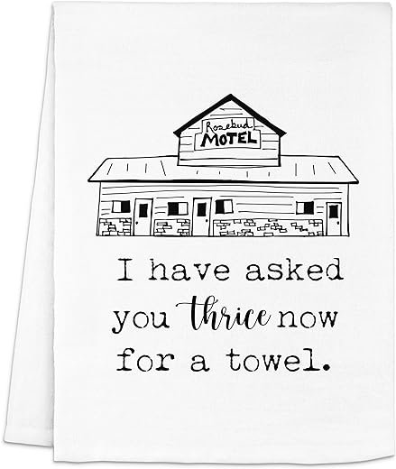 - Brighten up your home with this cute and funny flour-sack dish towel! Laughing burns calories, so use these punny towels for giggle filled dish drying, as a charming hand towel for your bathroom, or as a cute gift to a friend!