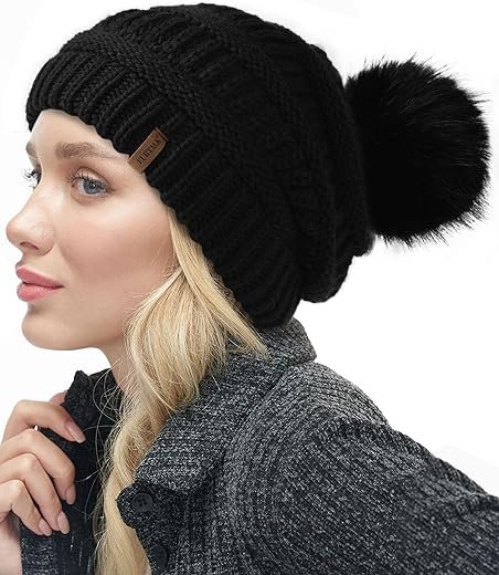 - 👒Material: The knit beanie hat is made of 100% soft Acrylic, with 100% polyester faux fur pompom on the top of the hat which is thick and comfortable; Make you feel warm and fashion;