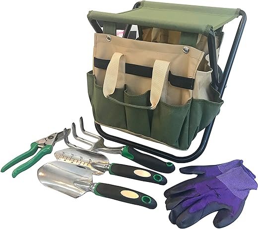 The All-in-One Garden Tools and Chair Set includes a high cast aluminum trowel, grass fork, transplanter, pruning shears, carry bag, and gardening gloves. The fully foldable stool seat is lightweight and portable, making it easy to use in the garden all day long. The set also includes bamboo gardening gloves and 4 aluminum hand tools with ergonomic handles. This set makes a great gift for gardening enthusiasts and is manufactured with excellent quality control and materials.