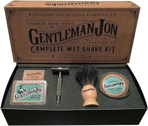 - COMPLETE MEN’S SHAVING KIT: The Gentleman Jon Shaving Kit for Men is a comprehensive set that includes a safety razor, badger hair brush, alum block, shave soap, stainless steel bowl, and five razor blades – everything needed for a luxurious, comfortable and smooth wet shave experience. With its compact design, our product is also a suitable travel companion to those who value traditional shaving, ensuring a neat shave even while on the go.