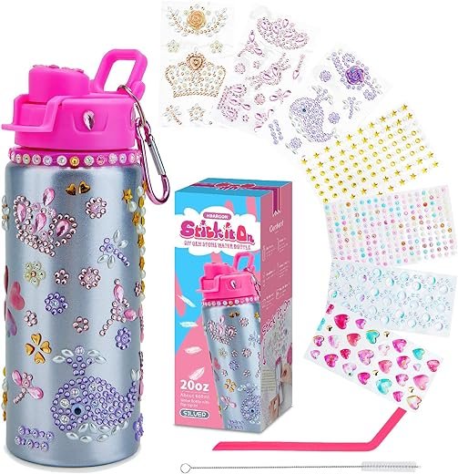 This kid’s water bottle is both super fun and great value! It comes with 7 sheets of rhinestone stickers, hundreds of glitter gem stickers, a reusable silicone straw with a cleaning brush, and a nail sticker. The bottle is eco-friendly and convenient for daily use. It’s also safe and high quality, with a BPA-free construction that is easy to clean. The top lid is secure and leak-proof, and the package even includes a carabiner for hanging the bottle. It makes for a perfect surprise gift, and the craft kit allows kids to personalize their own bottle and boosts concentration and creativity. We guarantee your satisfaction and provide segmented products.