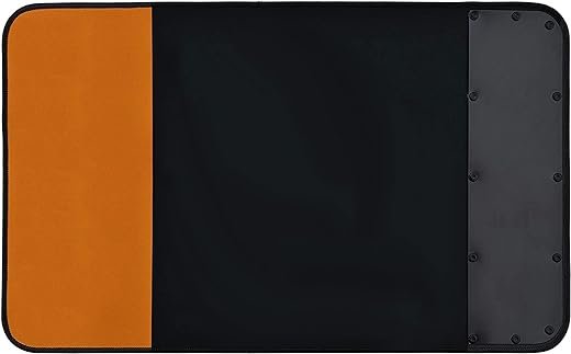 This polyester gun cleaning mat is 1/8 inch thick with a soft top to prevent scratches. It has a neoprene backing to keep it in place during use. The moisture-resistant surface allows for easy cleaning and prevents oil from leaking through. With a size of 20 x 12 inches, it is suitable for handguns and comes with a clear print diagram for Glock accessories. It also includes a zippered pouch for storage. The mat features a magnetic board for small items and has high-quality edge stitching.