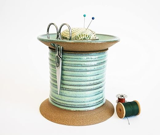 The Nostalgic Spool Shaped Bobbin Notions Holder is a unique and handmade solution for organizing and decorating your sewing room. Made from durable ceramic, it features a wool-stuffed pin cushion topper, storage compartments for sewing machine feet, parts, and accessories, a scissor slot holder, and more. It keeps everything you need for mending patches in one convenient place. Improve your sewing room organization and add a touch of nostalgia with this beautiful and functional holder. Available on various websites.