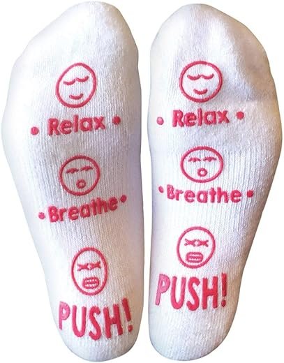- CUTE NON-SLIP DESIGN: These adorable non-skid socks are an essential item for pregnant women going into labor. The grippy ink on the bottom provides great traction for pacing the room, walking around the hospital and giving birth. The socks feature a motivating message that will be appreciated by all those in the delivery room: “Relax, Breathe, PUSH!” A great alternative to hospital slippers that will keep her feet warm and comfy. Fits easily in a pre-packed hospital bag or maternity kit.