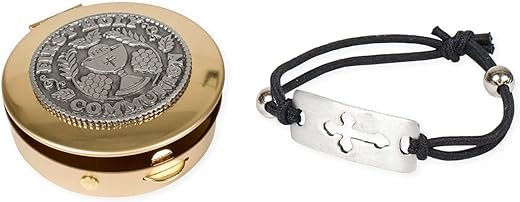 Make your loved one’s First Communion extra special with this detailed stretch bracelet and matching rosary box. The pendant is made of durable metal and the bracelet is stretchable for a comfortable fit. The rosary box is compact and measures 2.5 x 0.5 inches. This set is the perfect gift for a special boy in your life. It comes in protective packaging, making it ready for easy gifting.