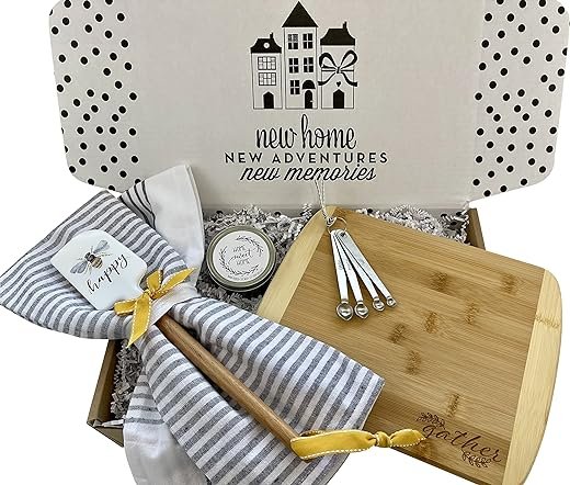This gift box is perfect for new homeowners, as it includes a bamboo cutting board with the word “gather” etched on it, two premium dish towels, a fun spatula, a soy scented candle labeled “home sweet home,” and a unique set of measuring spoons. The box itself is beautifully designed with the message “New Home, New Adventures, New Memories.” It can be sent as a gift with a personalized message and is double boxed for extra protection. Please note that we only recommend products and do not provide any manufacturing, warranty, or return services.