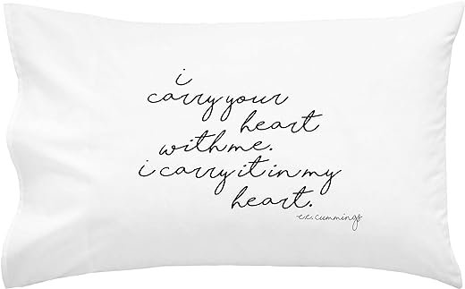 - FITS QUEEN SIZE PILLOW – One 20×30″ queen size white pillowcase with “I CARRY YOUR HEART WITH ME. I CARRY IT IN MY HEART” in BLACK stylish font.