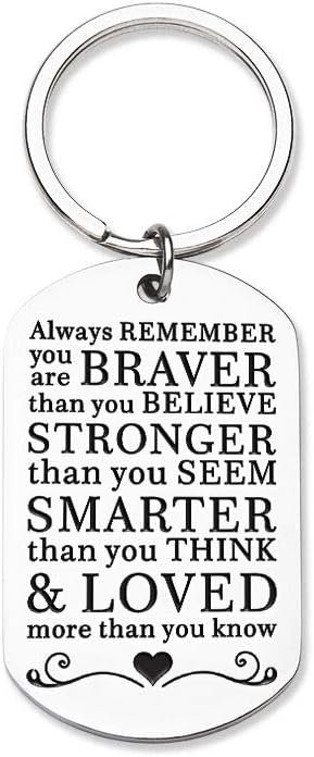 This keychain serves as a daily dose of inspiration, engraved with the powerful words, “always remember you are braver than you believe, stronger than you seem, smarter than you think, and loved more than you know.” Perfect for graduates, college students, or loved ones, it’s a sweet and funny gift that reminds them of their worth. Suitable for any occasion, this high-quality keychain comes with a free jewelry box and a 100% satisfaction guarantee.